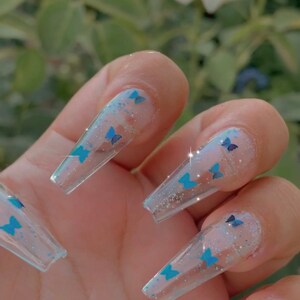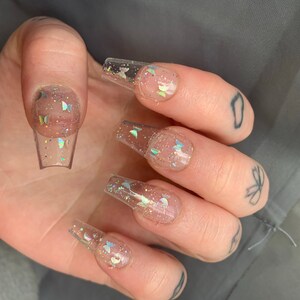 Clear. Clear pink glitter press on nails with holographic butterflies - Orders include 10 nails and a starter kit nail glue buffer and cuticle pusher - Available in 4 lengths - Nails are made to order - Made with gel nail polish - If you are between sizes SIZE UP it is better to go bigger since you can file them down to size. 126 N Perry Rd Plainfield IN Phone.