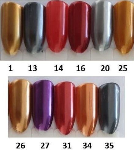 Gel polish - 15ml metallic. Available now - 70 tipsbox 10 sizes 7 of each 45 different colours. These are the exisiting colours.